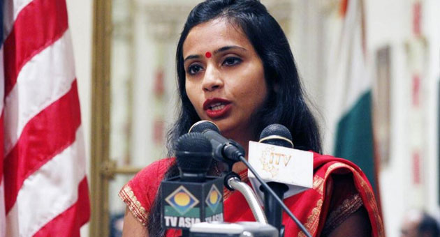 அமெரிக்காவின் விதிமுறைகளுக்கு மாறாக விசா நடைமுறையில் தவறு செய்ததாகவும், வீட்டின் பணிபெண்ணிற்கு குறைந்த ஊதியம் கொடுத்த குற்றத்துக்காகவும் கைது செய்யப்பட்டார். இவர் இந்தியாவின் கடுமையான முயற்சிக்குப் பின் இன்று நாடு திரும்புகிறார்.