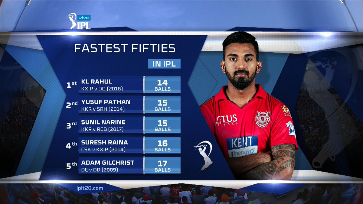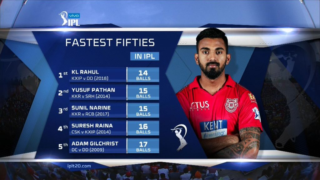 பின்னர் 167 என்ற இலக்குடன் களமிறங்கிய பஞ்சாப் அணியின் ராகுல் அதிரடியாக ஆடி 14 பந்துகளில் அரை சதம் அடித்தார் இதுவே ஐ.பி.எல் டி20 போட்டியின் அதிவேக அரைசதமாகும். இதற்க்கு முன் யூசப் பதான், சுனில் நரேன் 15 பந்துகளில் அடித்திருந்ததே சாதனையாக இருந்தது அதனை இன்று ராகுல் முறியடித்தார்.